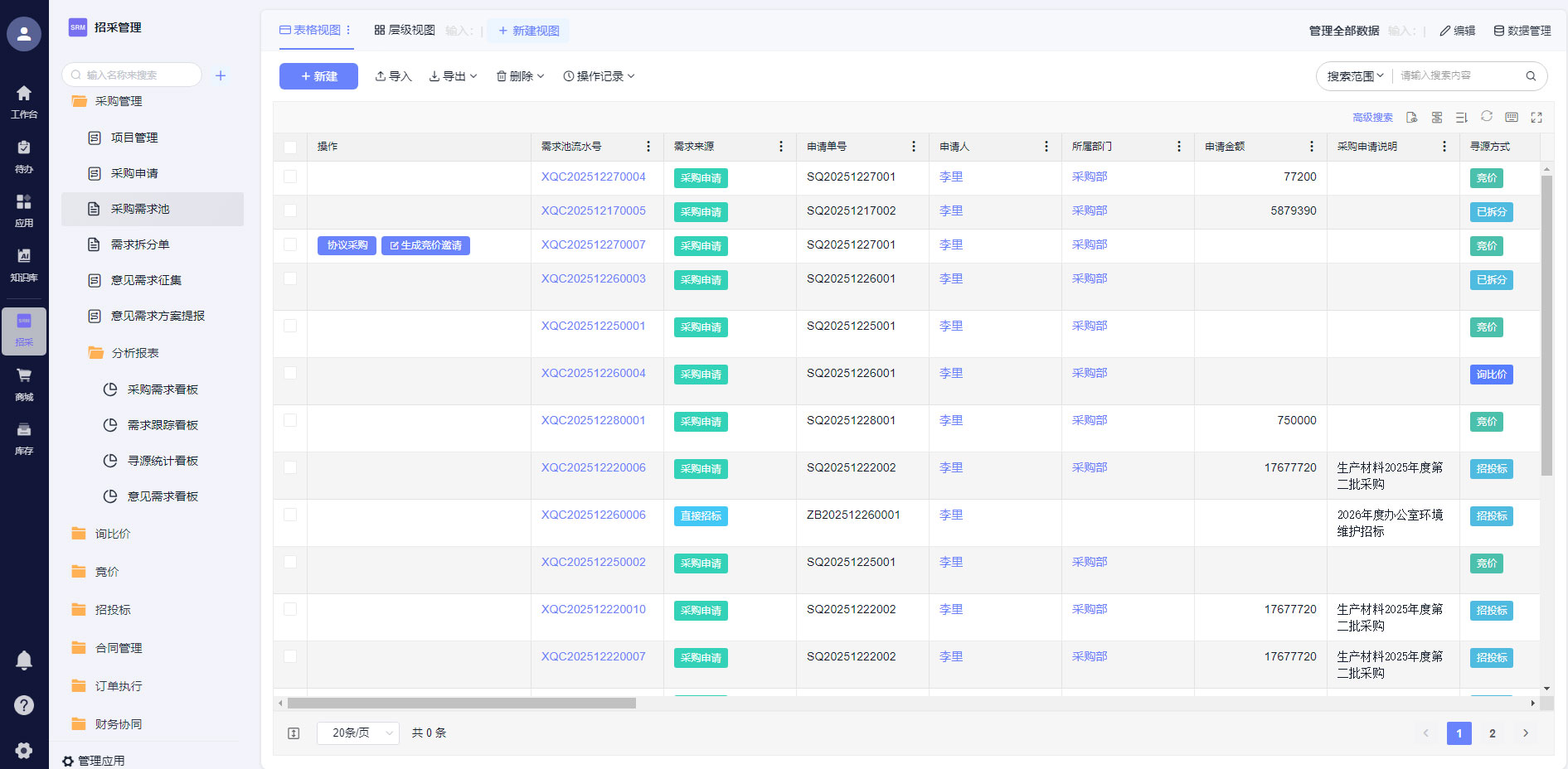 - 需求提报与管控:规范采购需求提报统一入口,审批流程留痕,有效管控随意采购与预算超支;建立集中采购需求池,动态管理所有需求,避免重复遗漏,统筹优化采购计划,实现资源高效配置。