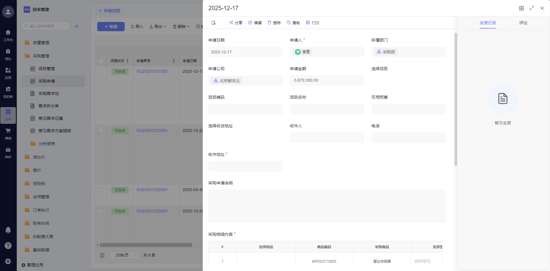 采购管理系统。双方携手打造覆盖供应商管理、采购管理、寻源招标、合同执行等全流程的一体化平台,深度集成飞书与 BC 系统,构建 “公开、公平、公正、透明”