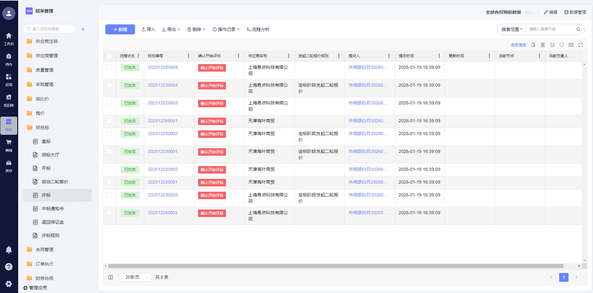 8%-25%;招标流程覆盖邀标、答疑、报名、投标、开标、评标、定标全环节,支持分标段招标与二轮报价,满足复杂采购需求。