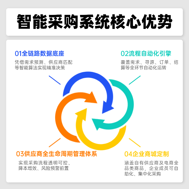鲸采云智能采购系统核心优势:以数据与算法为核心构建全链路数据底座,凭借需求预测、供应商匹配等智能算法实现精准决策;通过灵活可配置的流程自动化引擎,覆盖需求、寻源、订单、结算等全环节自动化运转;打造供应商全生命周期管理体系,实现采购流程透明可控、降本增效、风险预警前置;为企业搭建专属采购商城,涵盖自有供应商及电商全品类商品,企业成员可自助化、集中化采购,大幅提升使用体验和采购效率。在企业数字化转型加速的当下,采购作为企业成本控制与供应链协同的核心环节,传统采购模式下的流程繁琐、效率低下、成本难控、风险隐蔽等问题日益凸显。智能采购系统的出现,彻底打破了传统采购的局限,成为企业降本增效、强化供应链韧性的关键抓手。
