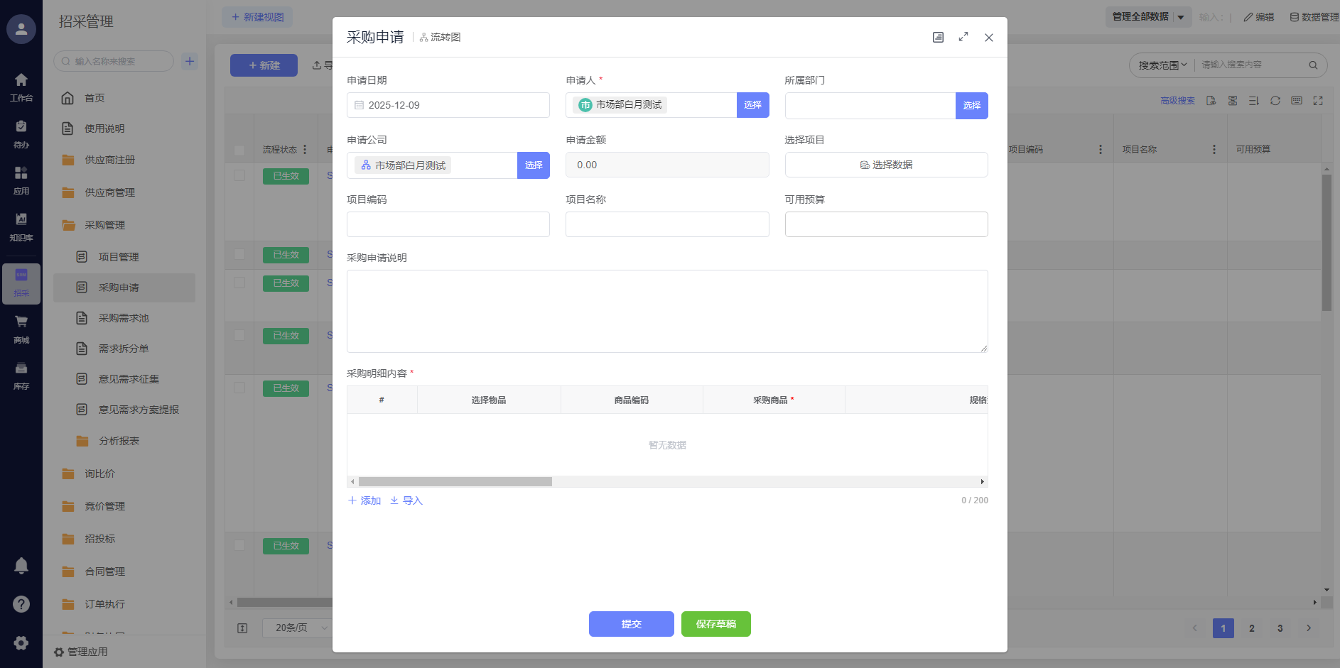填写采购物品名称、规格、数量等信息,可上传附件,提交后自动流转至对应审批人 |