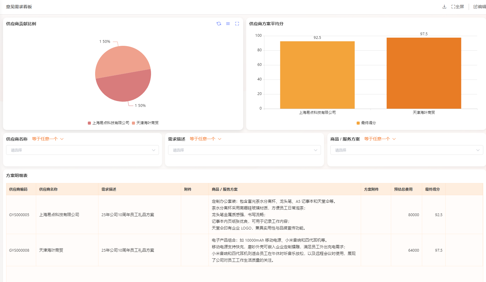 内置BI工具和可视化仪表盘,支持采购支出、供应商绩效等多维度分析;通过历史数据和市场趋势,实现智能寻源和价格波动预警。 |