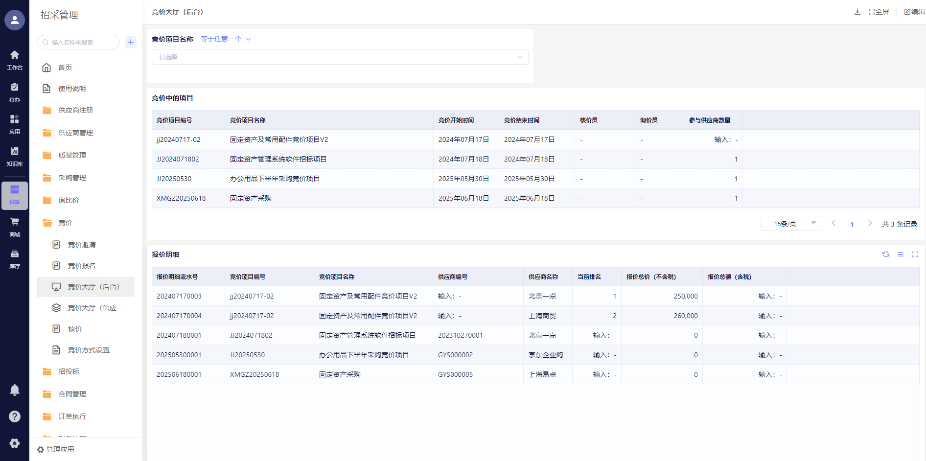 值得一提的是,鲸采云AI比价助手并非孤立功能,而是与采购系统管理软件的供应商管理、合同履约、财务协同等功能深度融合。比价得出的供应商报价与绩效数据,可为风险预警提供依据;风险预警发现的供应商异常信息,又能反向优化比价的供应商筛选范围,形成“数据互通、功能互补”的采购数字化闭环。