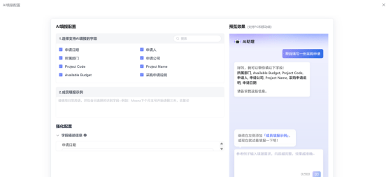 同时具备AI快捷填单功能,AI可全面掌握企业需求和采购制度,结合鲸采云SRM系统内的基础信息,根据用户的内容描述智能完成表单填写,通过标准化的智能填单配置,规避人工填单的遗漏与错误,大幅提升表单处理效率;