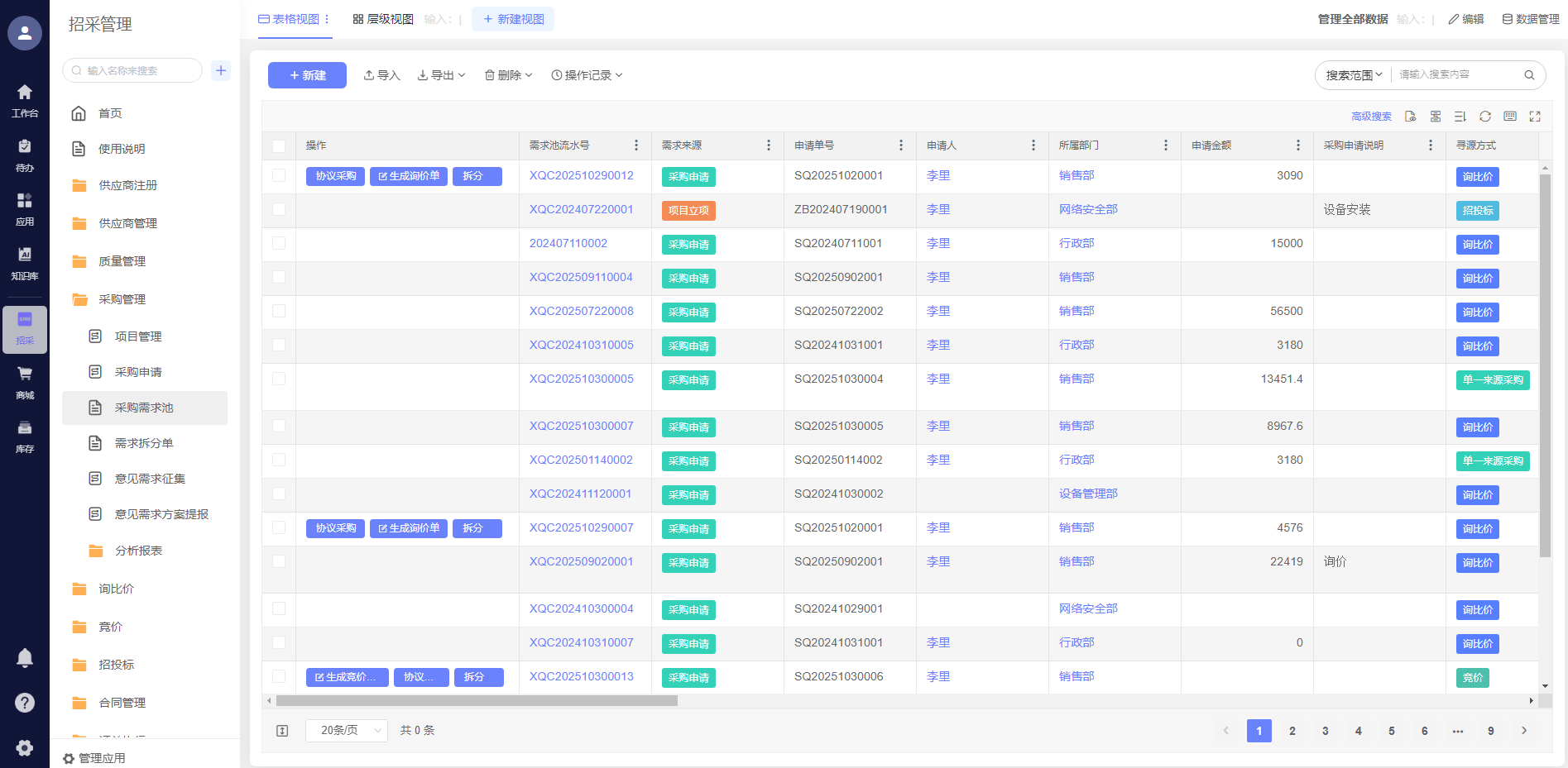 鲸采云 SRM 构建了从需求发起至库存结算的全流程功能体系,每个模块都精准匹配采购业务痛点: