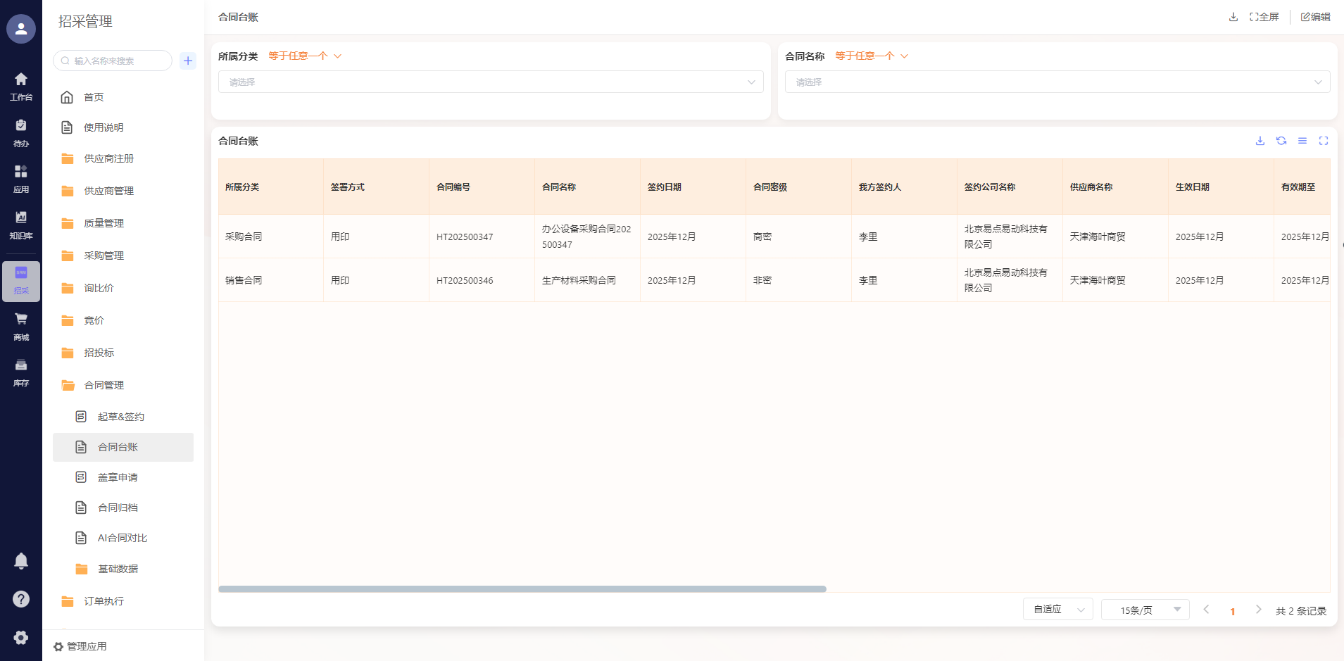 - 支持供应商注册、资质审核、类型分类(设备、原料、五金、信息服务等),建立合格供应商库;