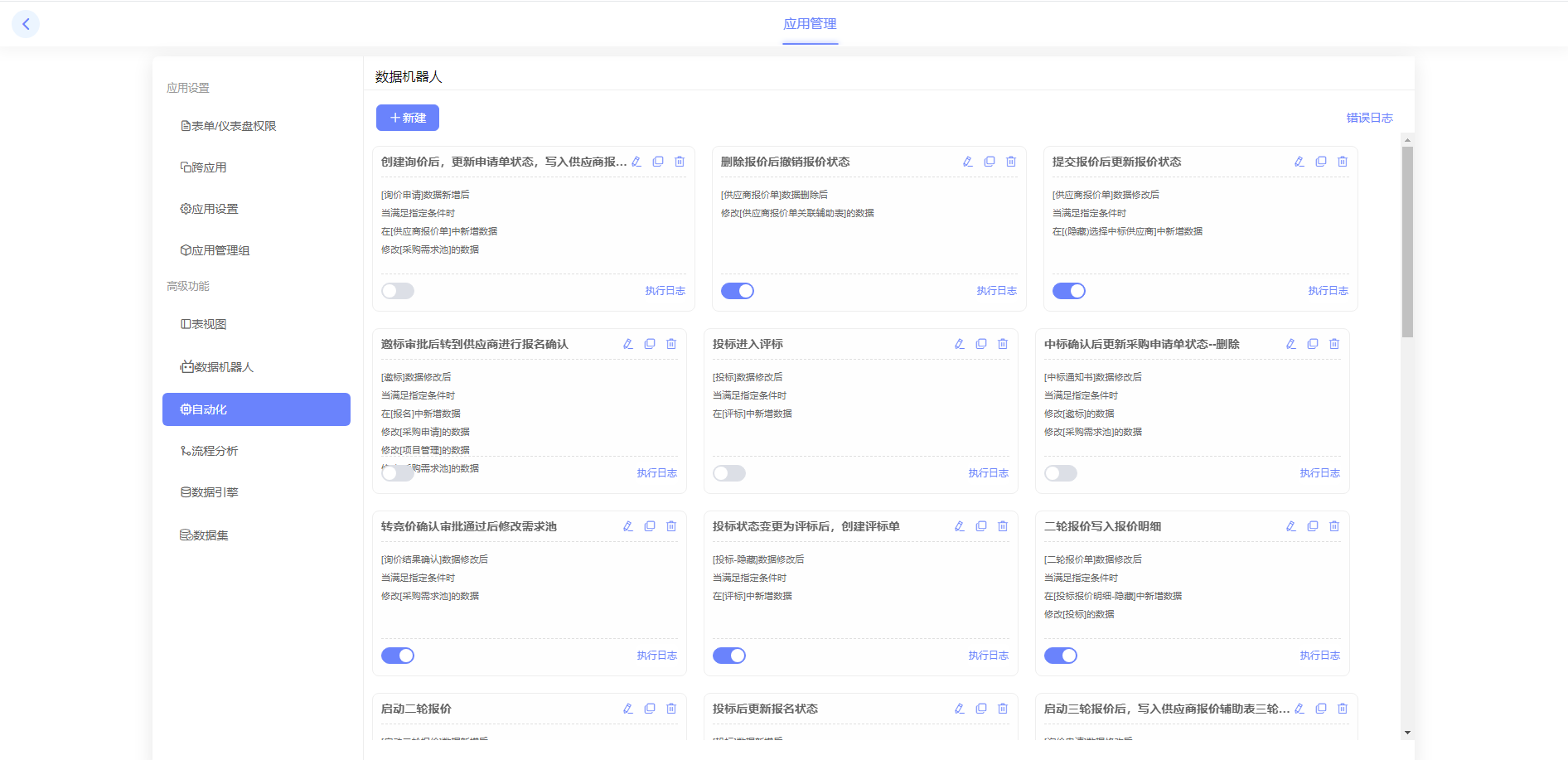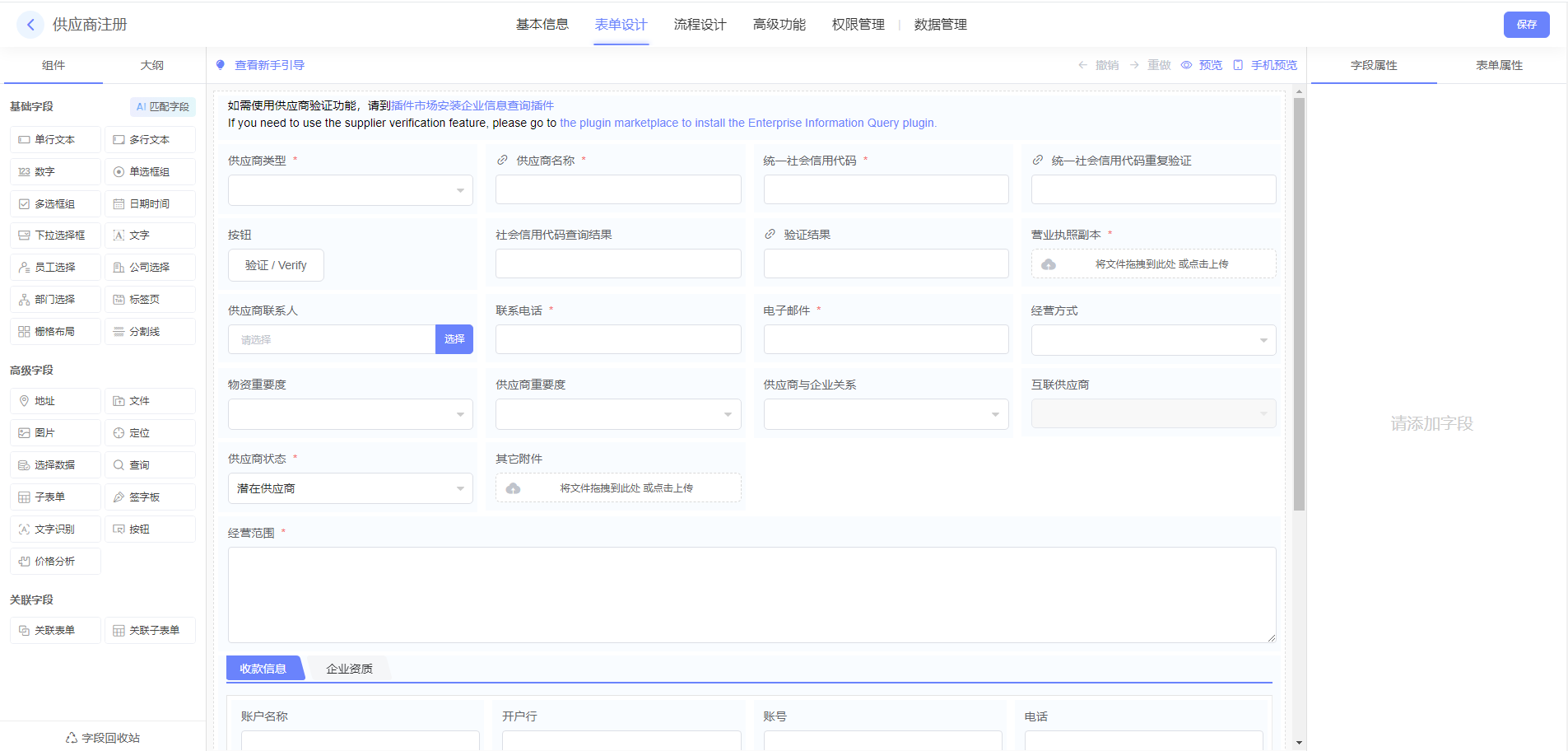 系统从表单字段、功能模块、业务流程、数据仪表盘到整平台对接,五个维度全面开放自定义权限。这意味着,从收集供应商信息的字段设置,到复杂的多级审批流程设计,企业都能自主调整。