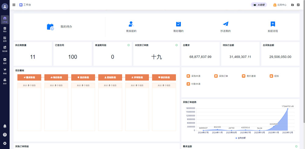 - 采购效率大幅提升:分标段招标与电子化寻源流程,使大型项目采购周期缩短 40%;供应商在线协同接单、发货、对账,跨区域沟通成本降低 50%,订单响应效率提升 60%。