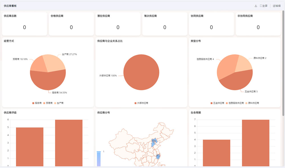 - 数据驱动绩效考评:制定标准化供应商质量管理模板,根据履约及时率、供货质量、服务响应等核心指标自动考评,形成优胜劣汰机制;供应商看板实时展示分布情况、状态统计、绩效排名等核心数据,为合作决策提供依据。