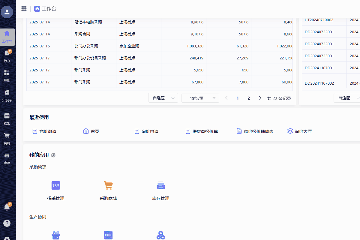 专业SRM功能 + PaaS能力,结合企业个性化业务需求进行灵活调整,拓展性强