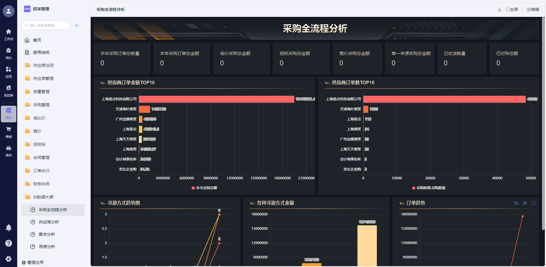 - 多维度数据分析:搭建供应商数据分析与采购订单数据分析仪表盘,通过多指标、多维度展示供应商合作情况与采购业务总览,为管理决策提供数据支撑。