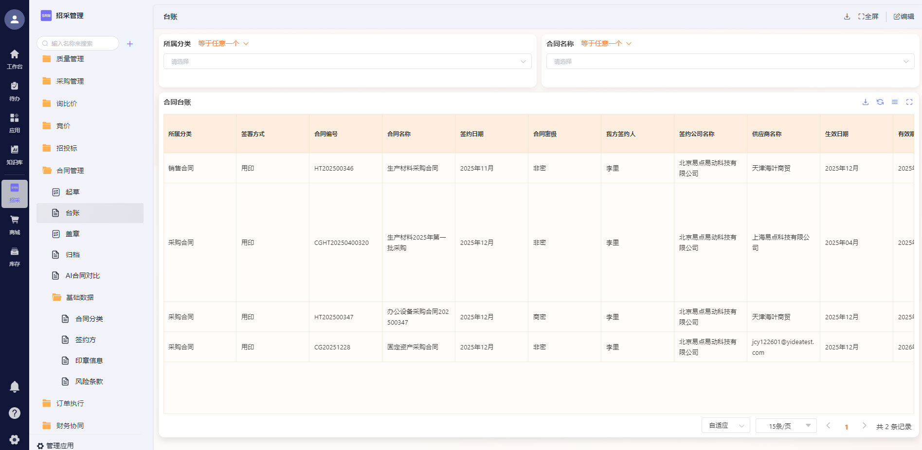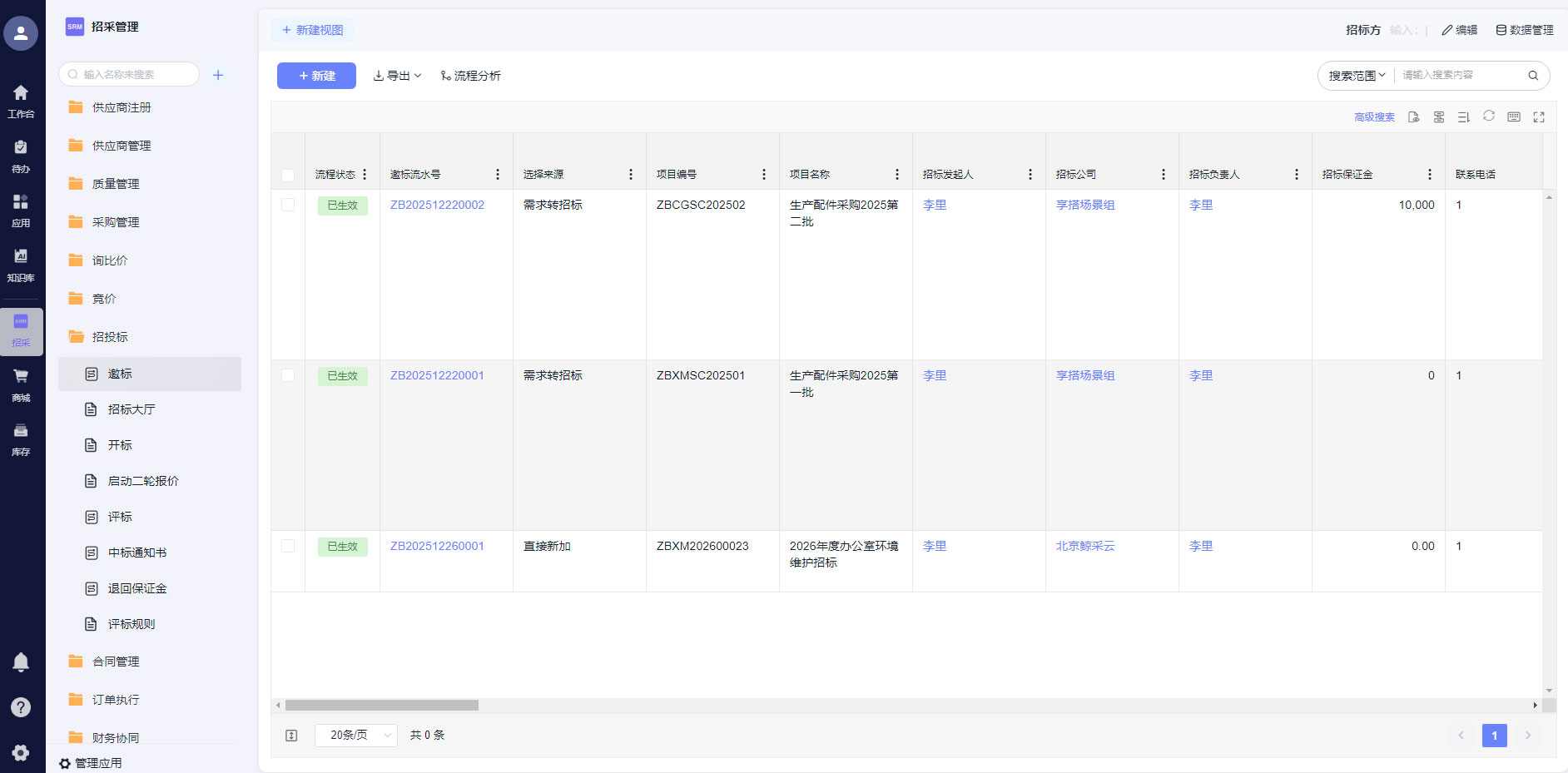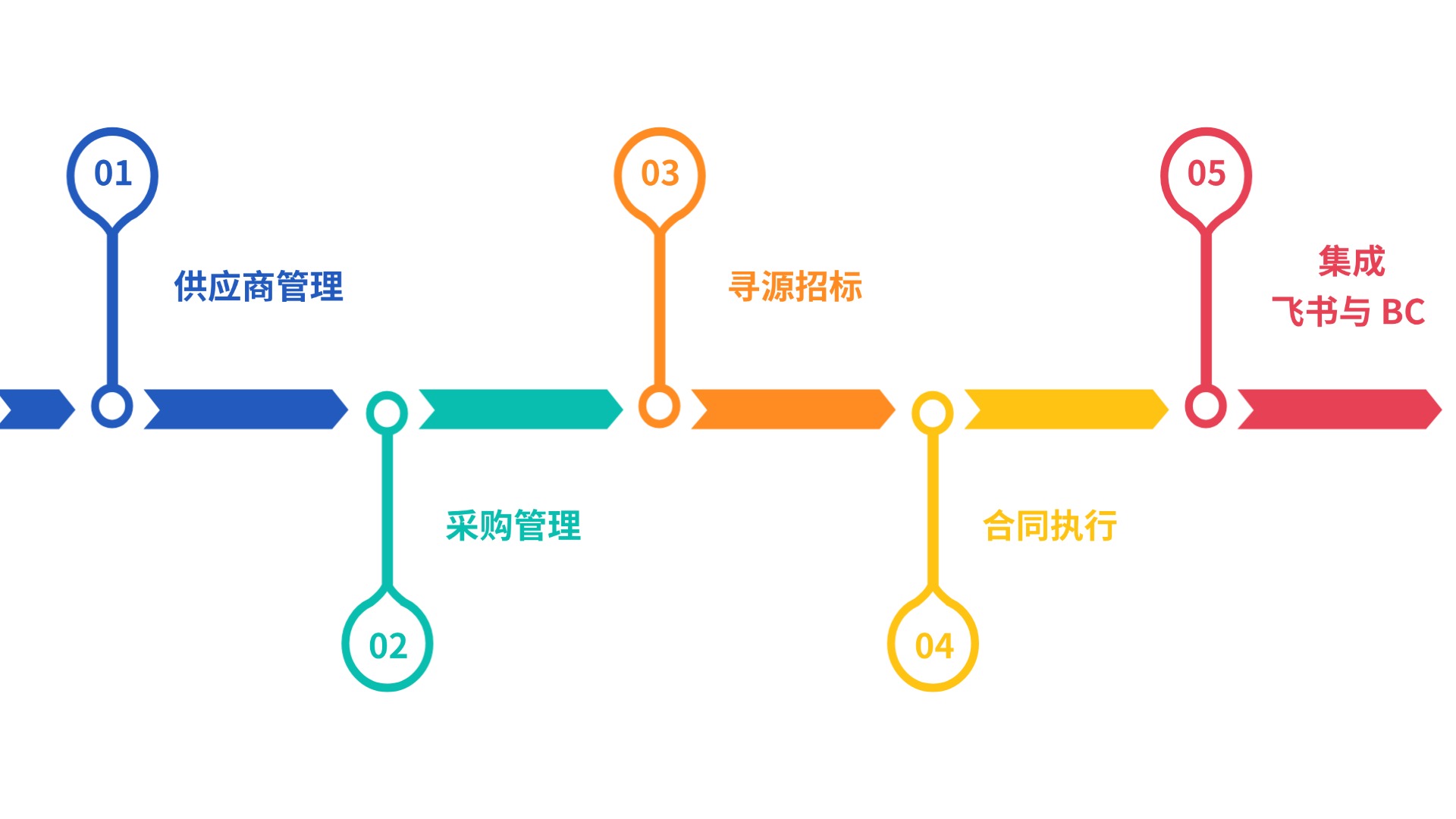 采购管理系统。双方携手打造覆盖供应商管理、采购管理、寻源招标、合同执行等全流程的一体化平台,深度集成飞书与 BC 系统,构建 “公开、公平、公正、透明”