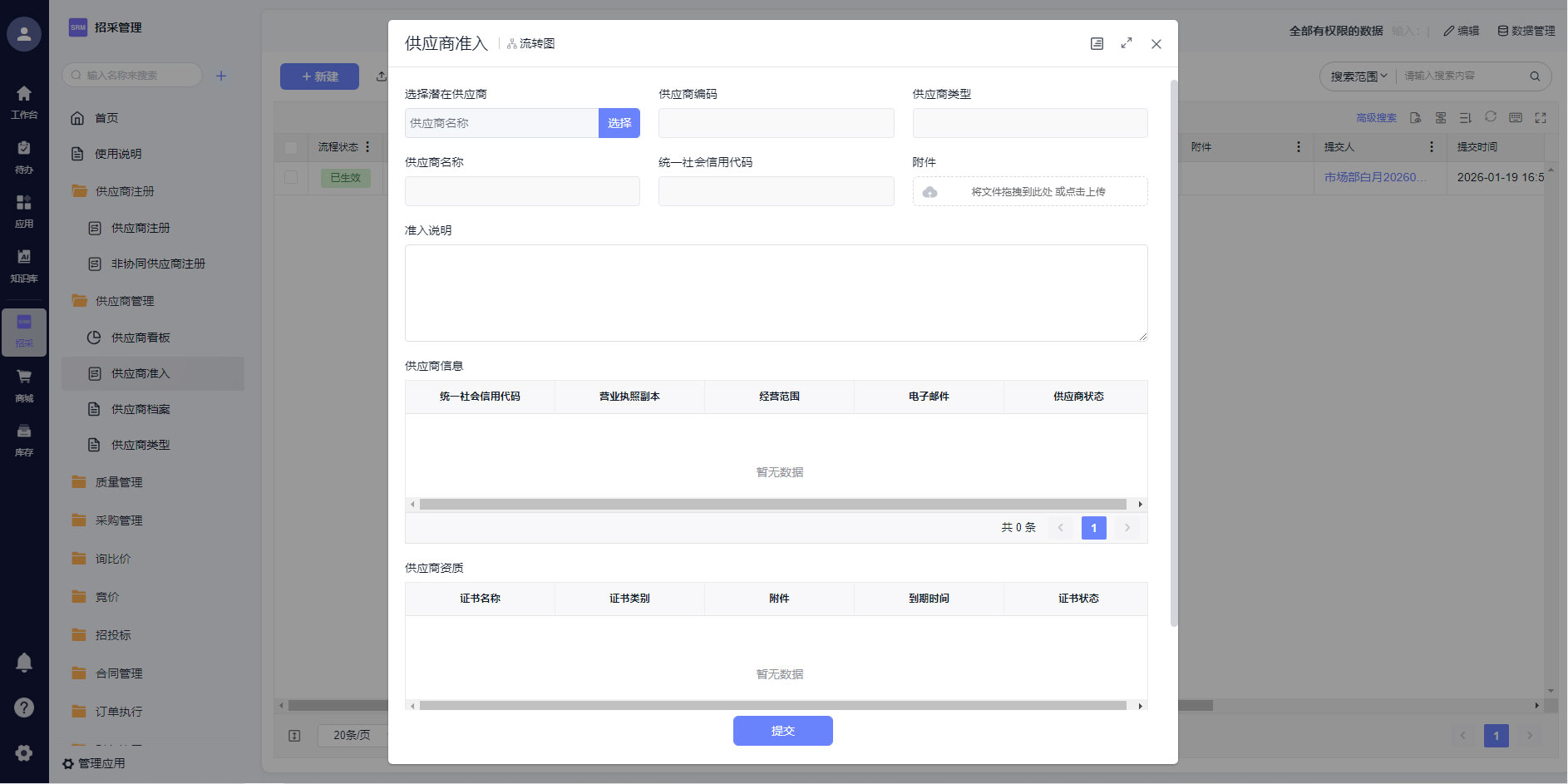 视图,统一维护联系人信息,避免协作断档;资质文件(营业执照、ISO 认证等)统一管理,到期自动提醒,按品类设定资质门槛,严控准入风险。
