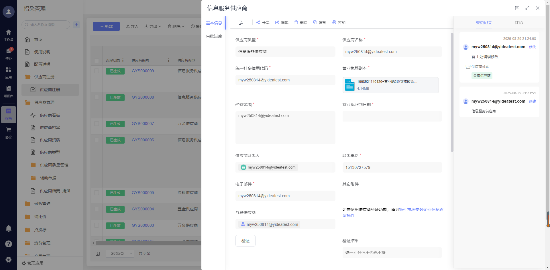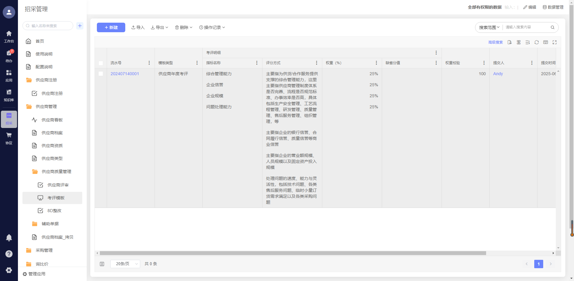 - 智能准入审核:系统内置标准化准入模板,供应商可在线提交资质文件,企业通过系统一键审核,自动记录审核结果,避免人工遗漏;