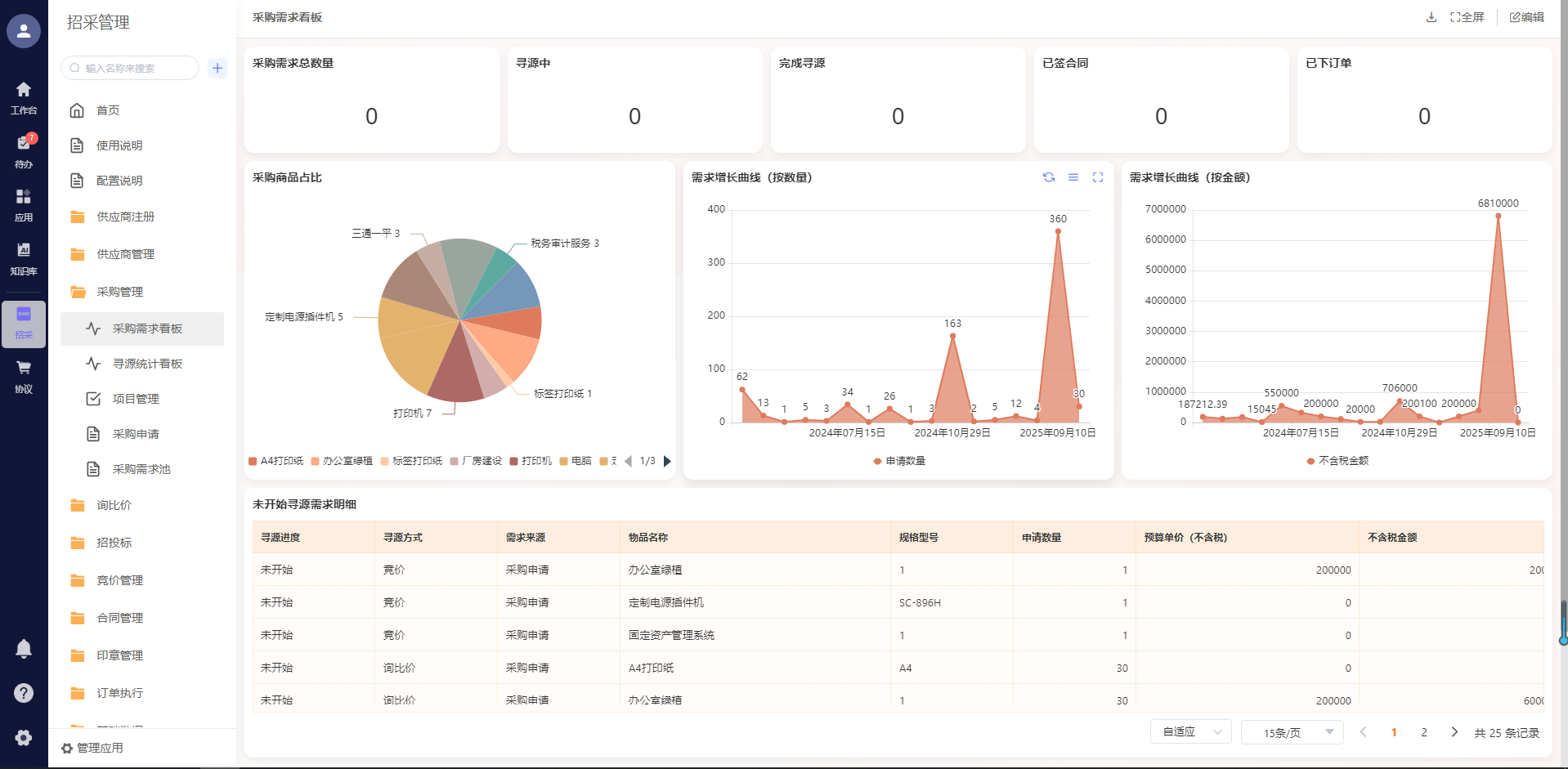 - 需求智能归集:支持各部门线上提报采购需求,系统自动汇总、分类、合并重复需求,生成采购计划,避免盲目采购与资源浪费。对于常用物资,可设置安全库存阈值,自动触发补货需求,实现