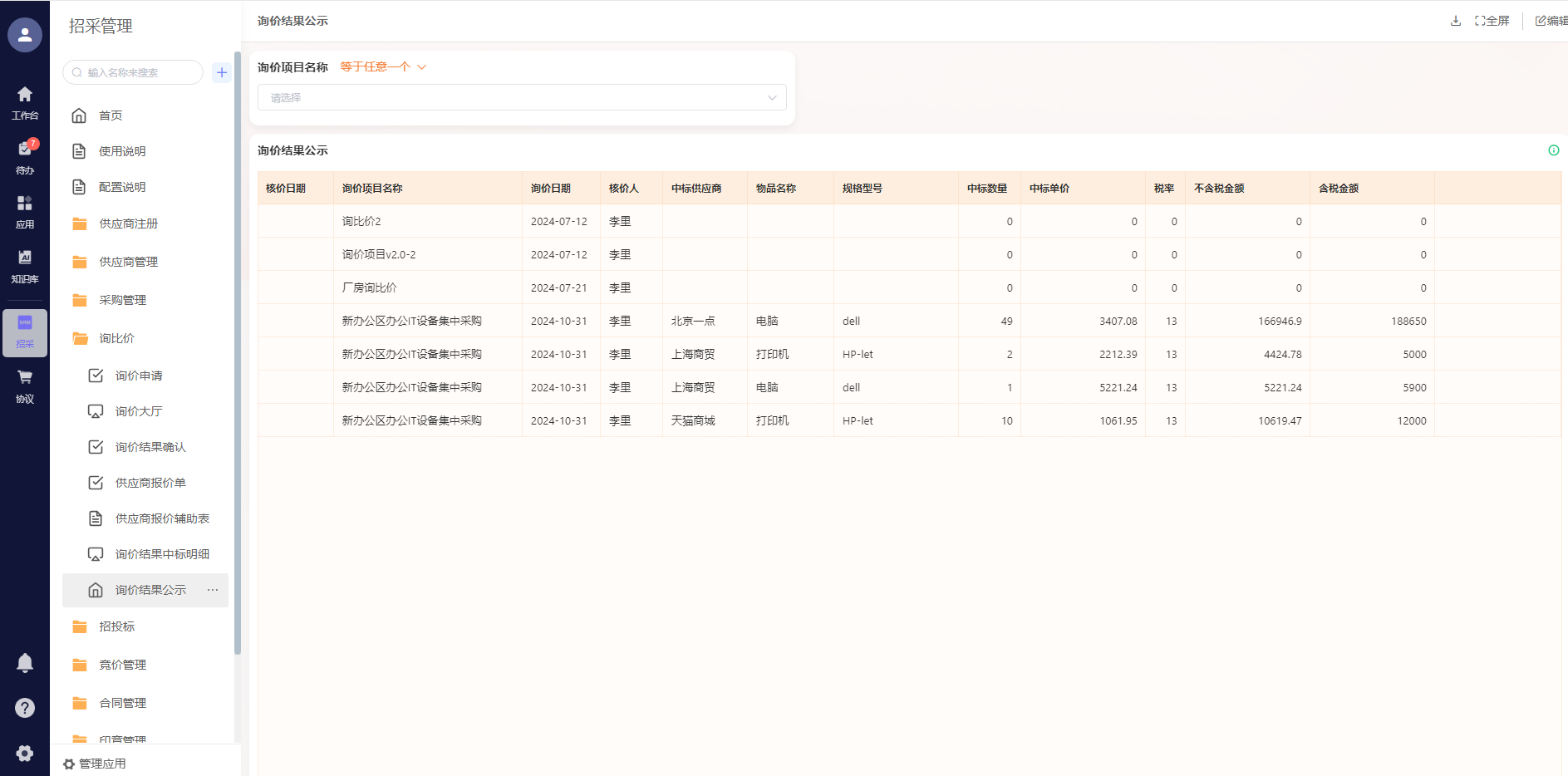 供应商比价:群发询价单至供应商库,系统自动比价(效率提升3倍)。