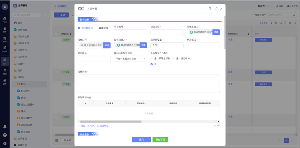 - 分标段招标适配大型项目:针对海外大型工程项目,支持拆分为多个标段独立招标,可灵活配置各标段供应商资质要求、评审规则及合同条款;招标大厅集中发布项目信息,供应商在线报名、下载标书、提交投标文件,全程电子化流转,大幅提升复杂项目采购效率。