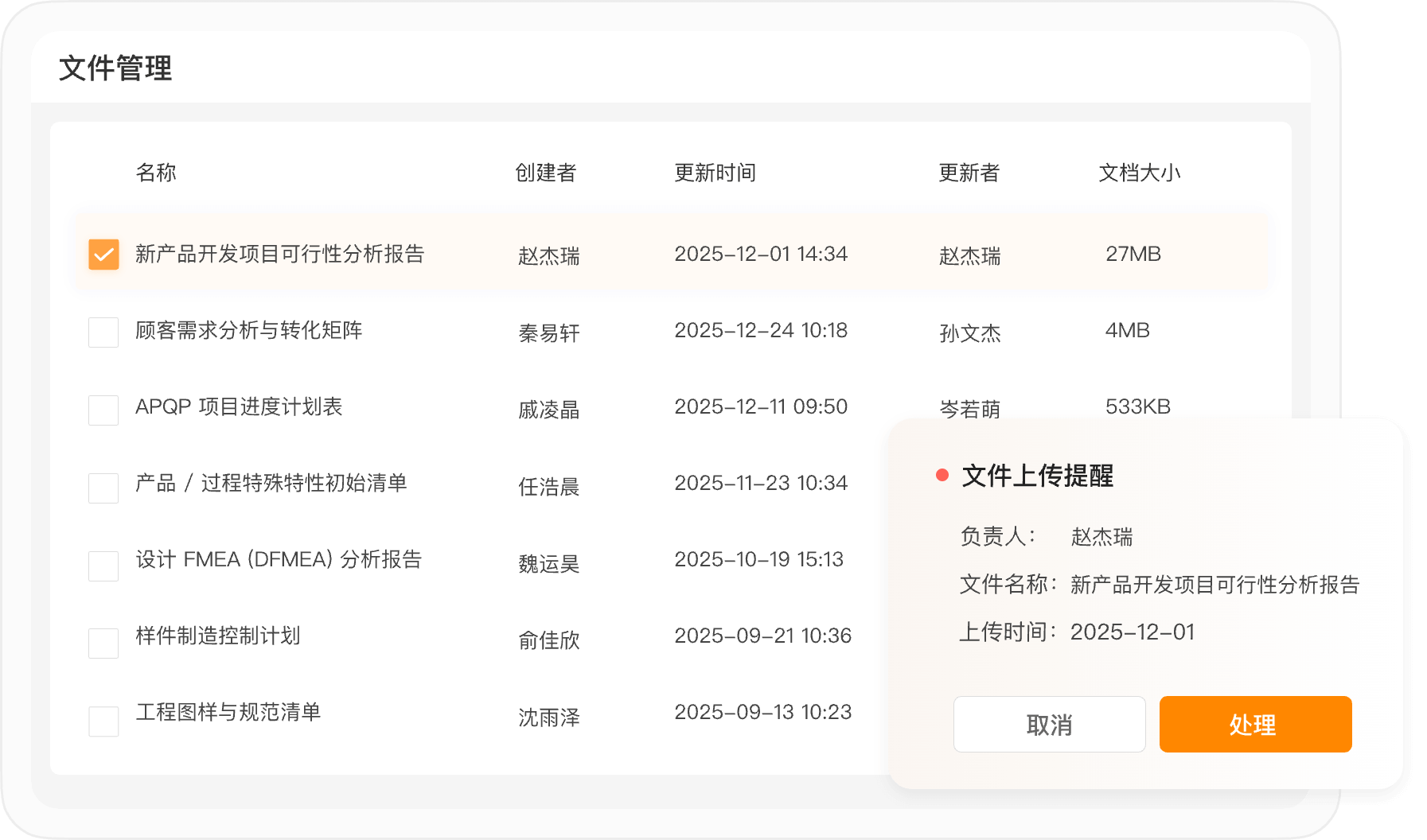 支持 APQP/PPAP 等场景自定义业务阶段与文件模板,适配新品开发需求;