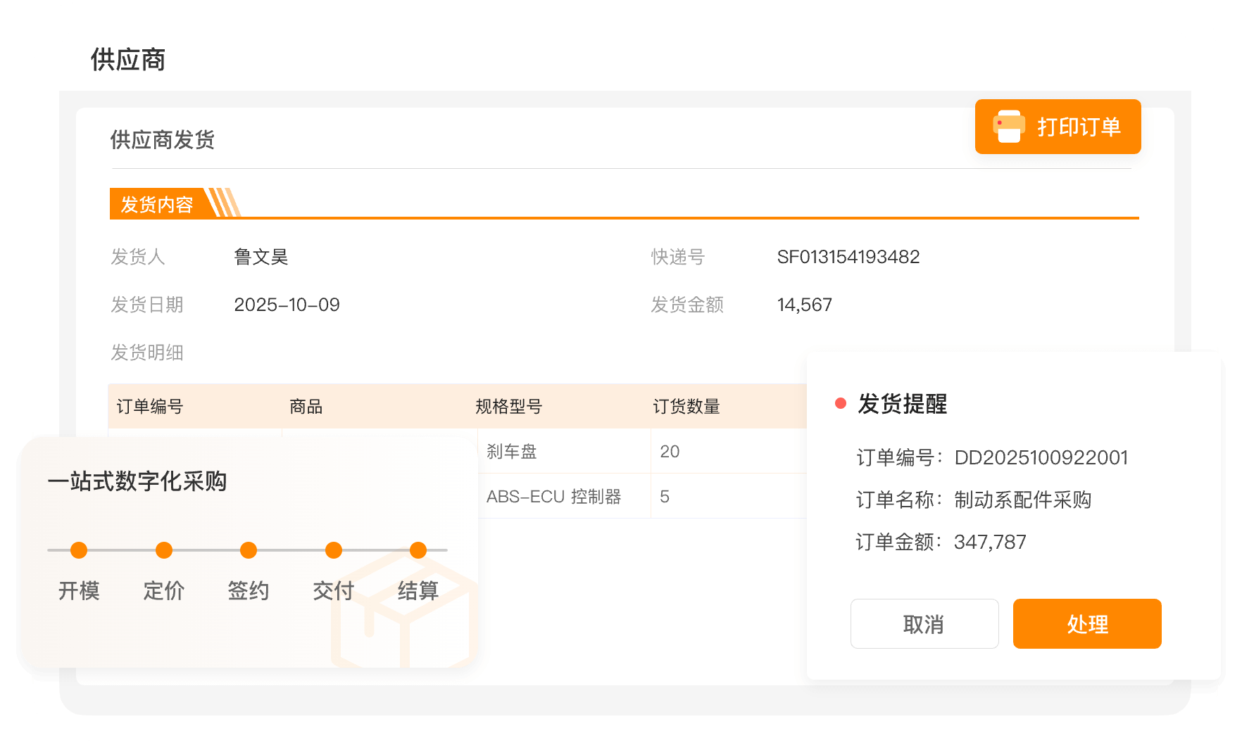 打通开模、定价、签约、交付到结算的全流程,通过在线单据和实时提醒,助力研发高效追踪进度,提升采购效率;